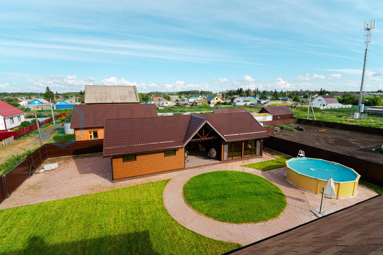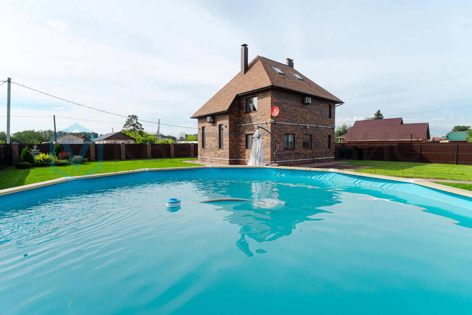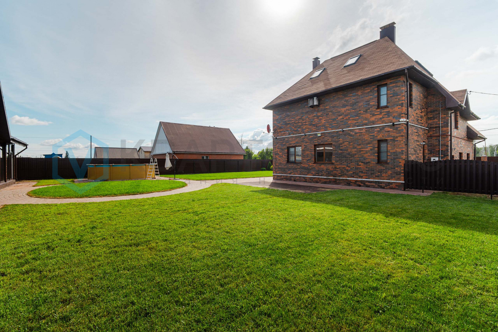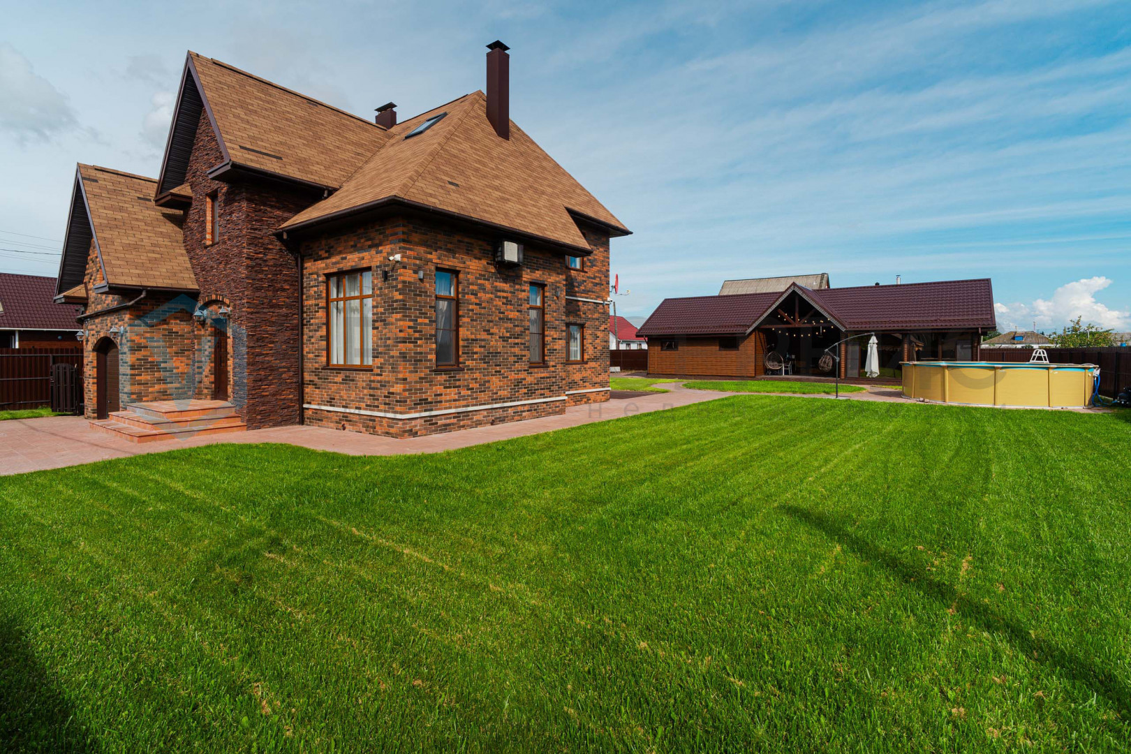 Придомовая территория зонирована: газон и тротуарная плитка перед домом, огород с посадками - грядки с сортовой клубникой, малина, яблони. Газон для установки каркасного бассейна. На всем участке установлен автополив.