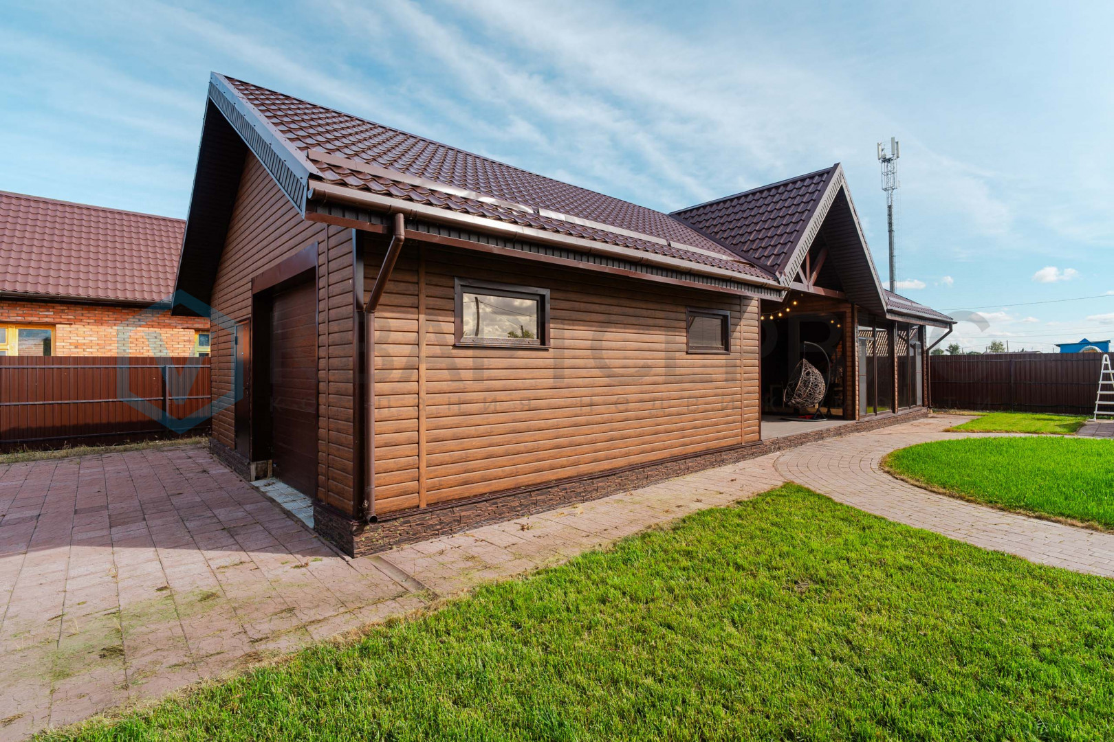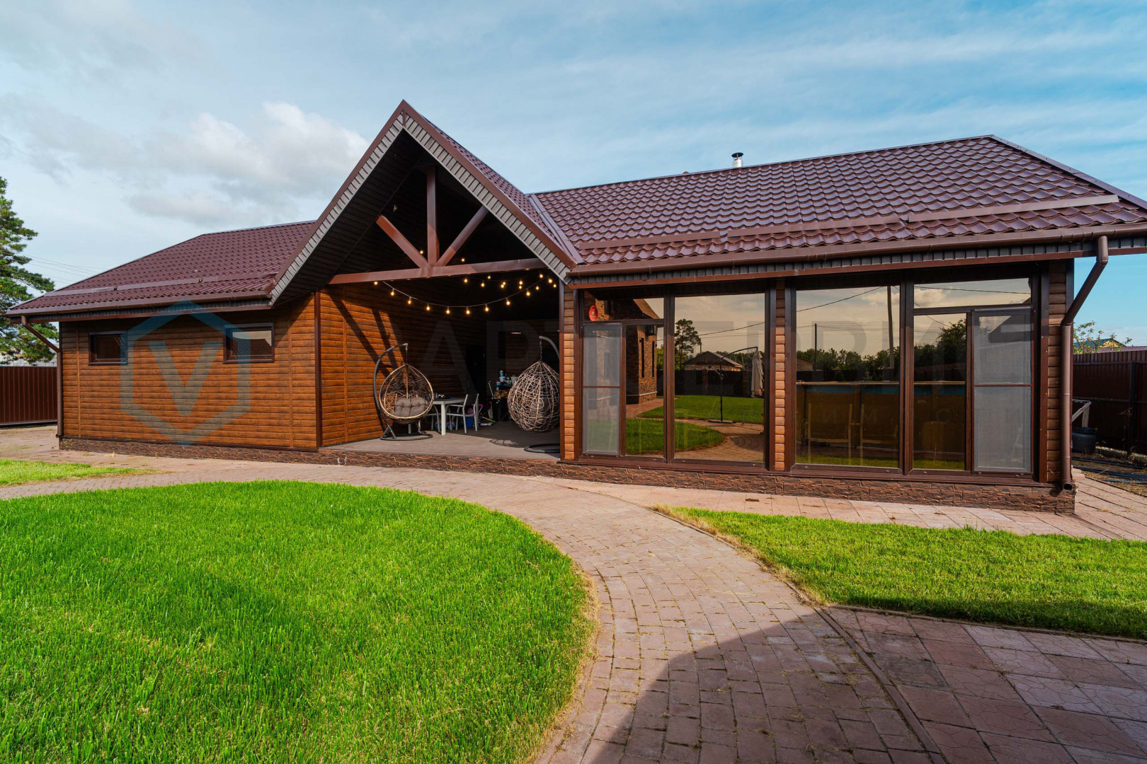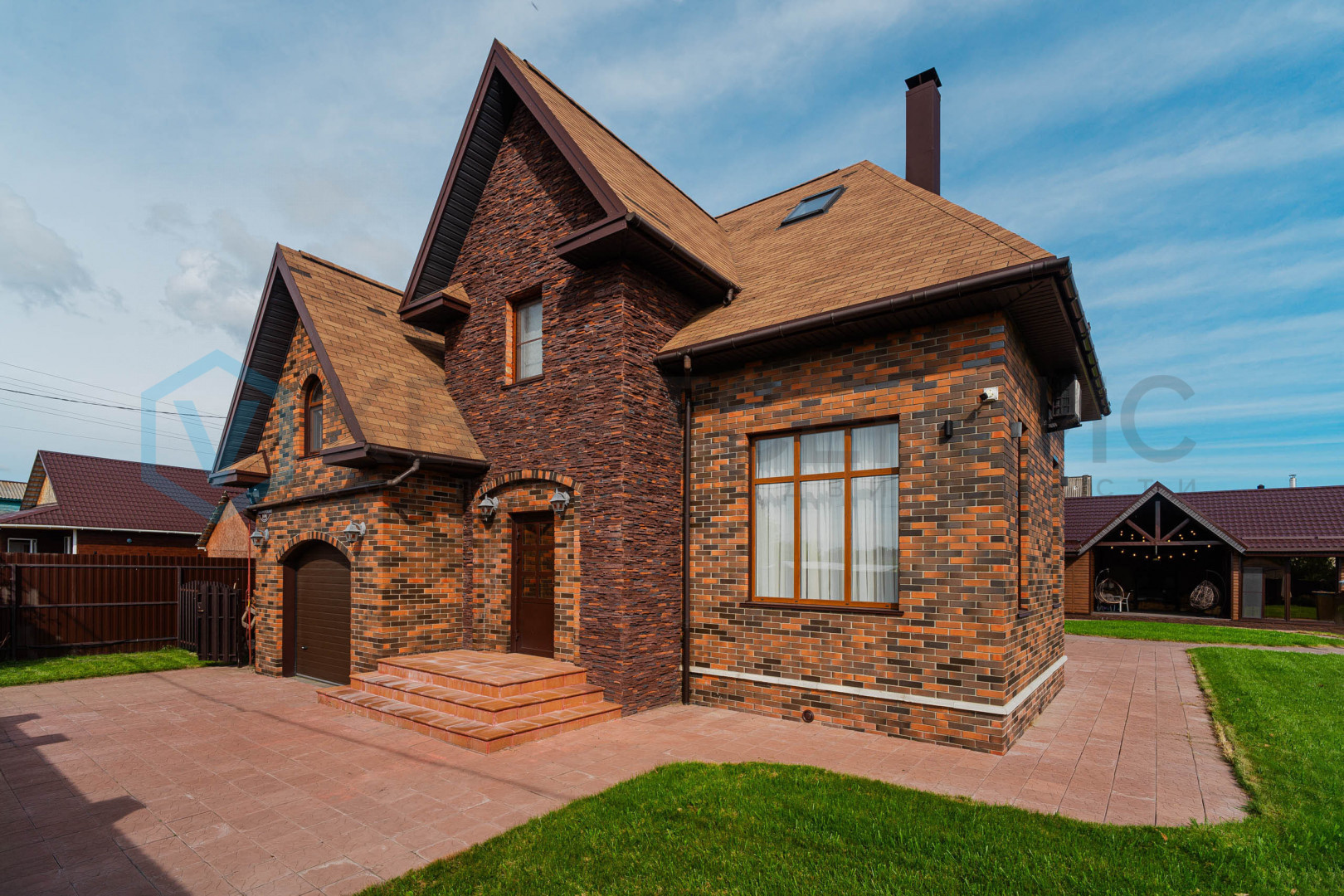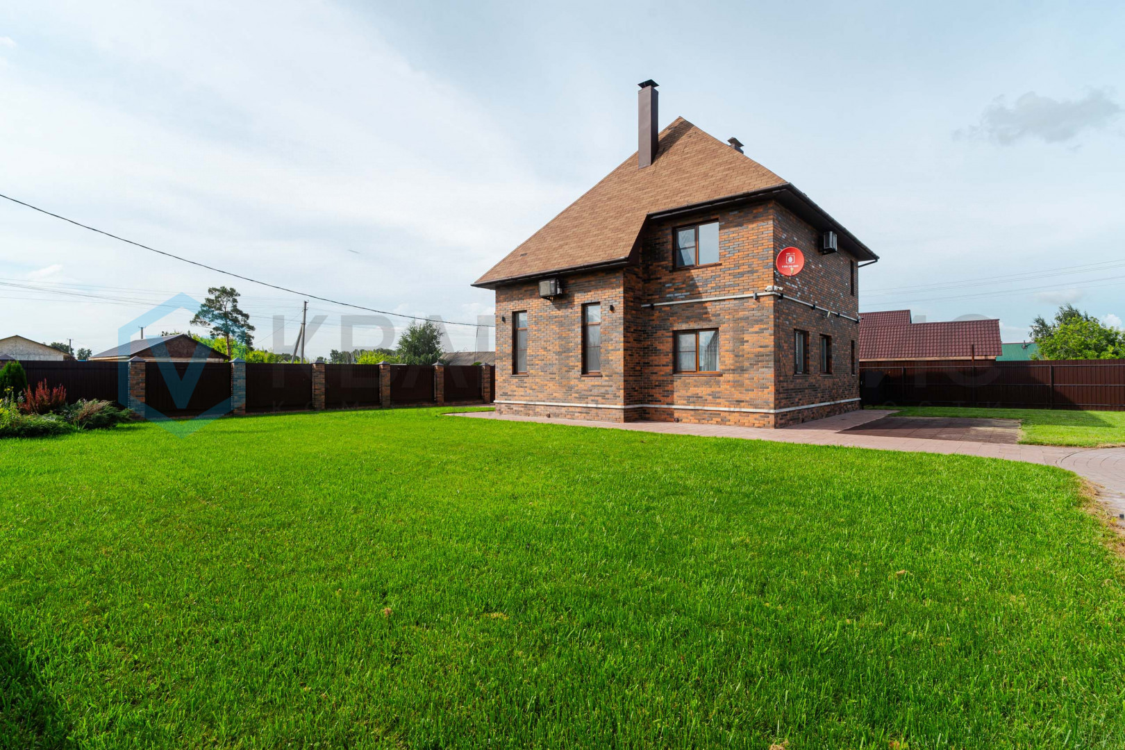 Придомовая территория зонирована: газон и тротуарная плитка перед домом, огород с посадками - грядки с сортовой клубникой, малина, яблони. Газон для установки каркасного бассейна. На всем участке установлен автополив.