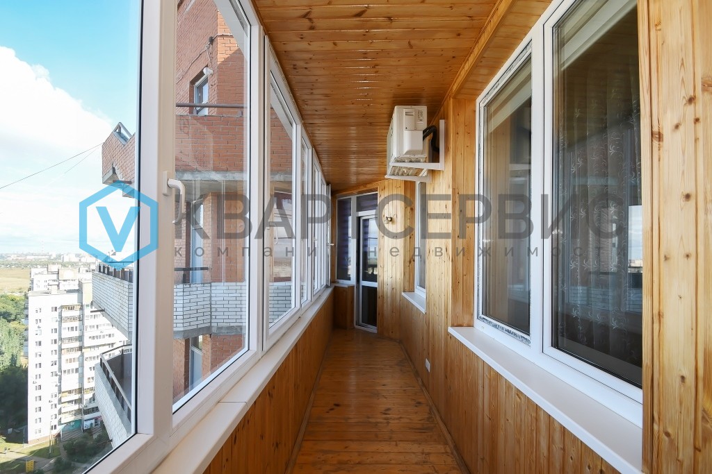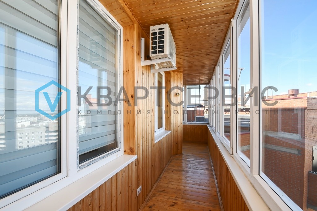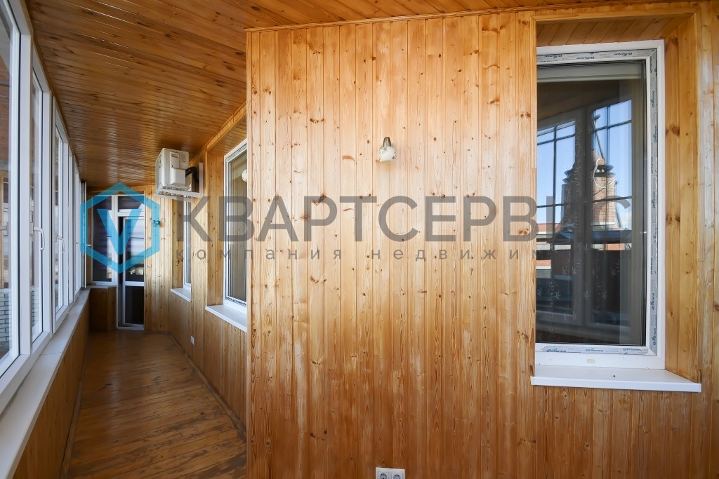 - Просторный балкон с обшивкой из вагонки и остеклением.