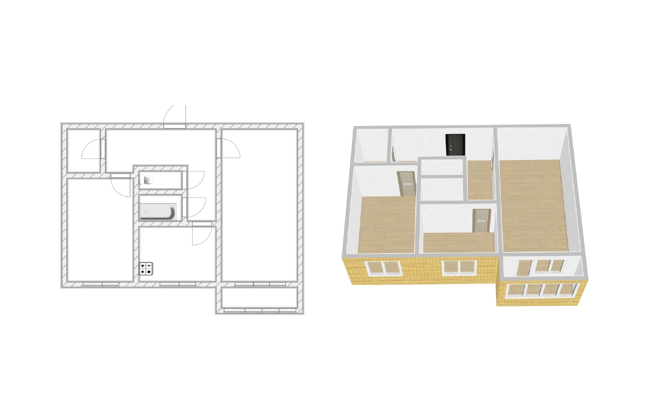 Планировка: 2 изолированные комнаты, просторная кухня 8,9 м2., балкон. Отдельно расположены места общего пользования (душ и туалет) в общей секции (на три квартиры).