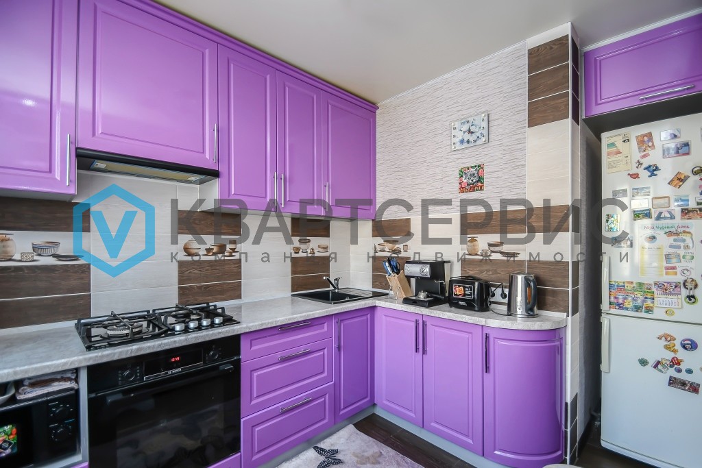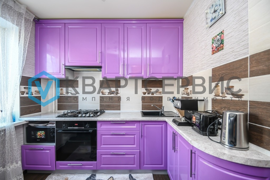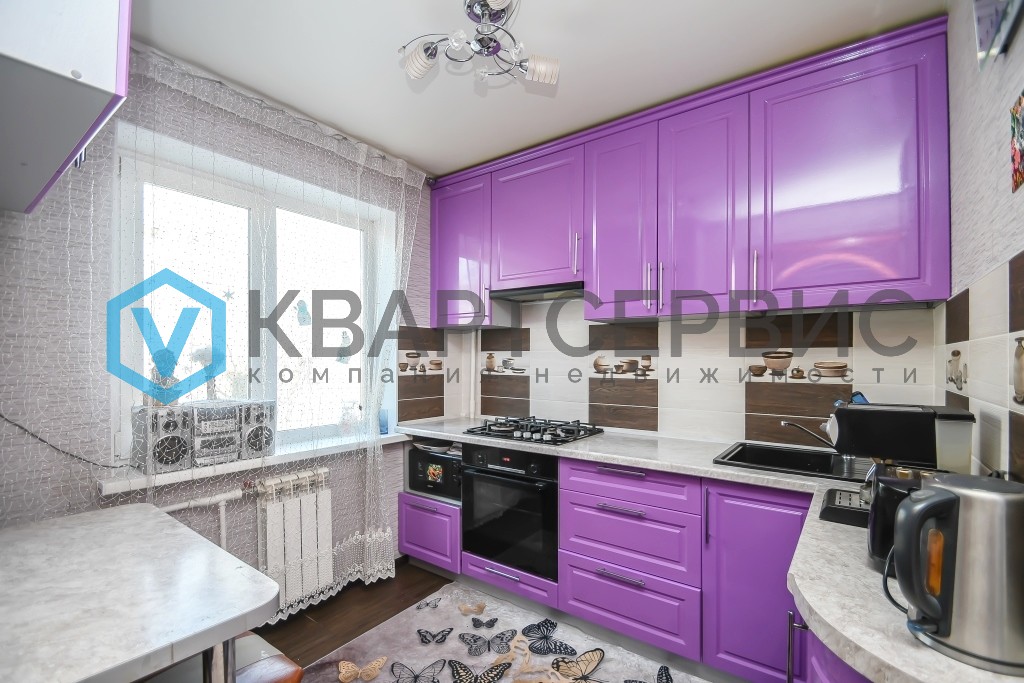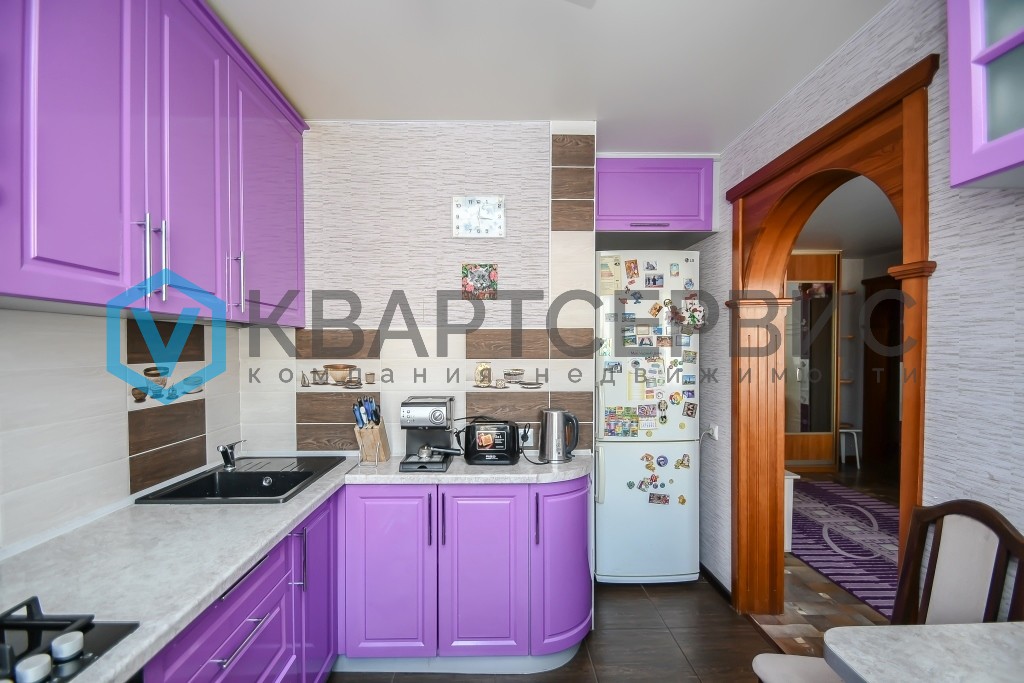 Вся корпусная мебель остаётся новому владельцу: добротный кухонный гарнитур с встраиваемой техникой, а также три  вместительных шкафа-купе, интегрированных в интерьер в единой цветовой гамме с межкомнатными дверями.